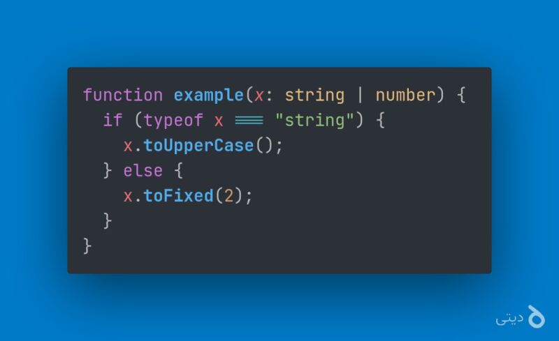 توی این کد دو عملیات Narrowing انجام گرفته: یکی برای بلاک if و یکی هم برای else. با این ویژگی، با پارامتر x توی بلاک if فقط به صورت رشته رفتار میشه. برای مثال اگه متد toFixed رو صدا بزنیم خطا میگیریم. چون توی این بلاک، x فقط به صورت رشته قابل دسترس هست. همچنین توی بلاک else تایپاسکریپت میدونه که نوع x دیگه رشته نیست و قطعاً عددی هست. پس با اون مثل یک عدد رفتار میکنه.