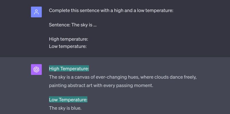 برای مثال از ChatGPT میخوایم که جمله The sky is ... رو یک بار با Temerature بالا و یک بار با Temperature پایین کامل کنه: