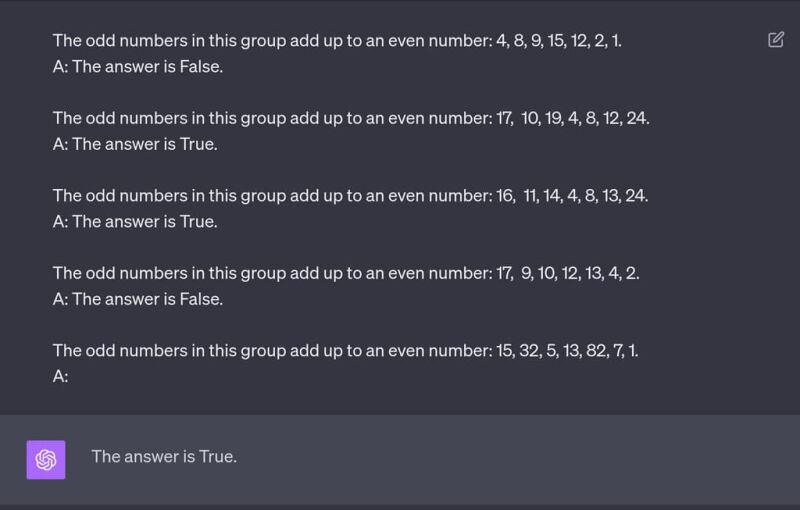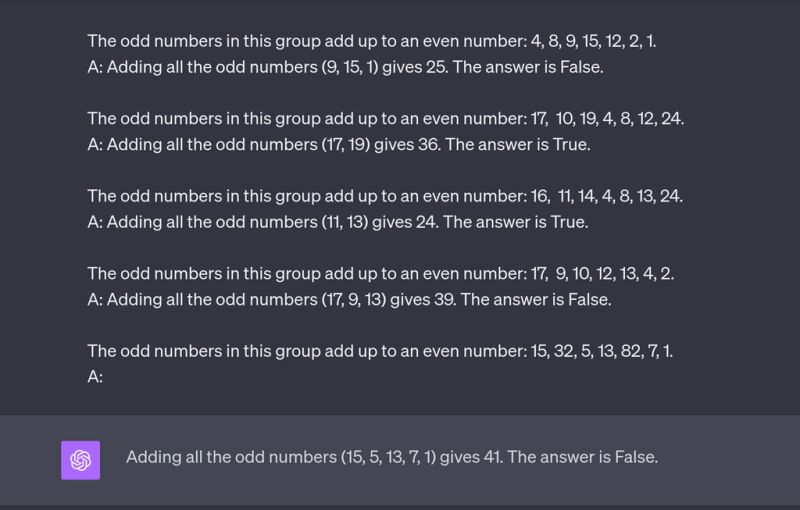 ما برای ChatGPT گروهی از اعداد رو مشخص کردیم و گفتیم اعداد فرد رو با هم جمع کن، اگه حاصل جمع یک عدد زوج بود، بهمون True برگردون و در غیر این صورت False. همونطور که میبینیم، برای مدل چند مثال مشخص کردیم و ظاهر پاسخ هم طبق فرمت مد نظر ما بود. اما جدا از ظاهر، خود پاسخ اشتباه بود. توی سوال، جمع اعداد فرد میشه 41. که یک عدد فرد هست. اما پاسخ مدل True بود به این معنی که حاصل اون جمع، یک عدد زوج هست. پس اینجا نتونستیم به جواب درست برسیم. ما با استفاده از یک تکنیک دیگه میتونیم چنین محدودیتی رو برطرف کنیم.