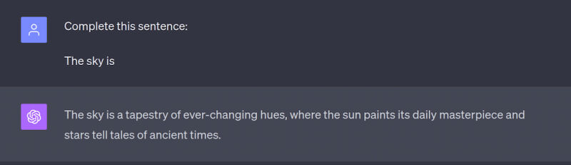 همونطور که میبینیم به ChatGPT صرفاً گفتیم «The sky is» و اون براساس دانش و فرضیات خودش چنین پاسخی داد. اما این پاسخ مد نظر ما نبود. برای مثال ما میخواستیم پاسخی کوتاهتر و توی یک جمله داشته باشیم. اینجاست که مهارت Prompt Engineering به کارمون میاد. کافیه Prompt رو کمی بهبود بدیم: