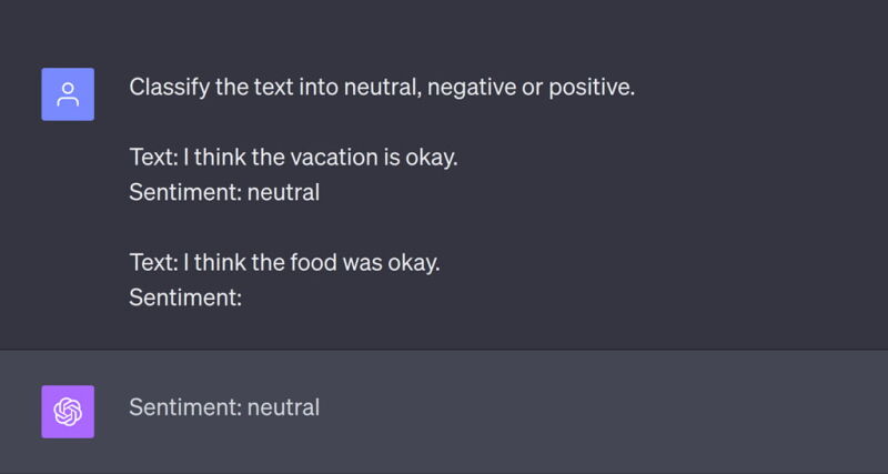 از ChatGPT پرسیدیم که کیفیت جملهٔ مد نظر ما رو با کلمات positive (مثبت)، neutral (خنثی) و negative (منفی) مشخص کن. جواب مدل درست بود، ولی نه دقیقاً طبق فرمت مد نظر ما. برای مثال ما میخواستیم یک پاسخ با حروف کوچیک داشته باشیم. همونطور که توی سوال مشخص کردیم. یعنی neutral، نه Neutral. اگه چنین نتیجهای برای ما اهمیت داره، ناچار هستیم توی یک پرامپت دیگه از مدل بخوایم لطفاً با حروف کوچیک جواب بده. که این روش بهینه نیست و برای حل چنین موضوعی یک تکنیک دیگه ابداع شد به اسم Few-Shot Prompting.